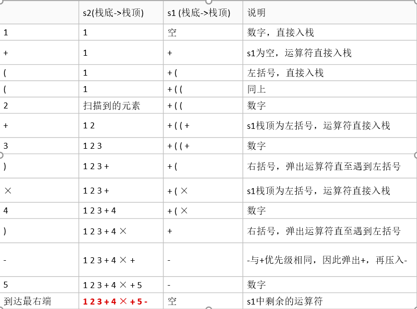举例说明:将中缀表达式“1+((2+3)×4)-5”转换为后缀表达式的过程如下: