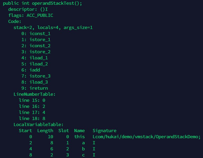 stack=2, locals=4已经分别指明了操作数栈最大深度为2,局部变量表最大需要4 slot的存储空间。