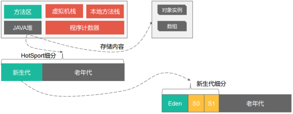 Java堆是垃圾收集器管理的主要区域。此很多时候也被称做“GC堆” 。在HotSpotVM中将堆细分为新生代、老年代,新生代又分为Eden、S0、S1区,他们都和GC相关。S0又叫From Survivor、S1又叫To Survivor。这些概念会在后续GC章节中详细讲解。