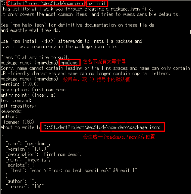npm init1根据提示输入相关信息,如果使用默认值,则直接回车即可。