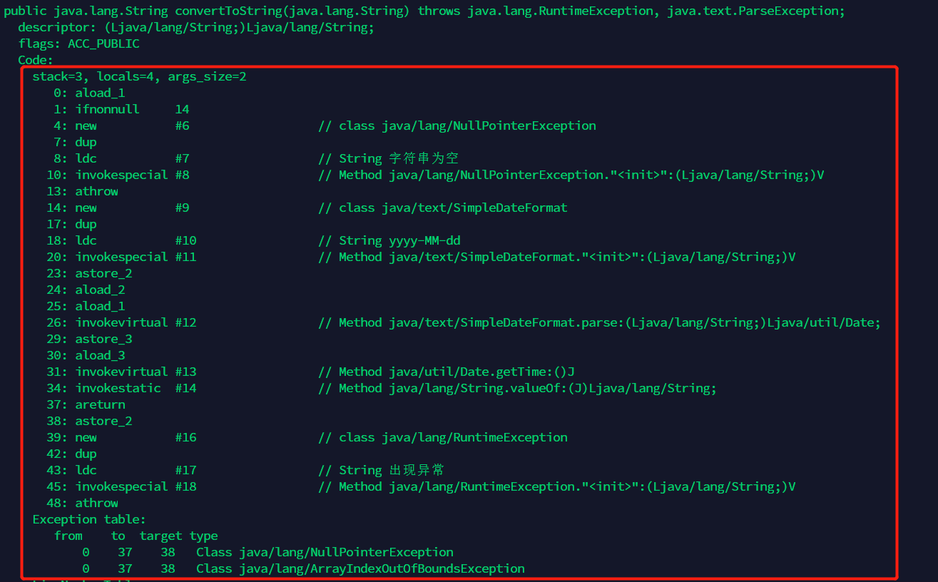 使用javap -v命令解析字节码内容,查看convertToString方法的解析结果如下: