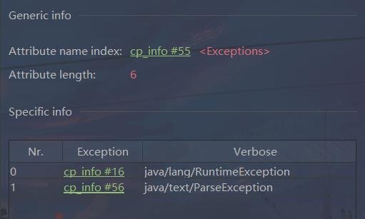 - exception_index_table为异常索引集合,一组u2类型 exception_index的集合,每一个exception_index为一个指向常量池中一CONSTANT_Class_info型常量的索引,代表该受查异常的类型