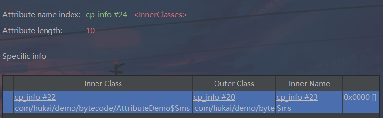 | u2 | inner_name_index | 1 | 索引值。指向内部类名称,如果为匿名内部类,则该值为0 |