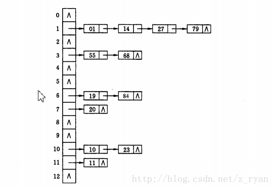 如关键字集合为{19,14,23,01,68,20,84,27,55,11,10,79},按哈希函数f(key) = key mod 13