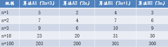 假设两个算法的输入规模都是n, 算法A要做2n+3次操作,即:先执行n次的循环,执行完成后再有一个n次的循环,最后有3次运算。 算法B要做3n+1次操作,理解同上 哪一个更快些?