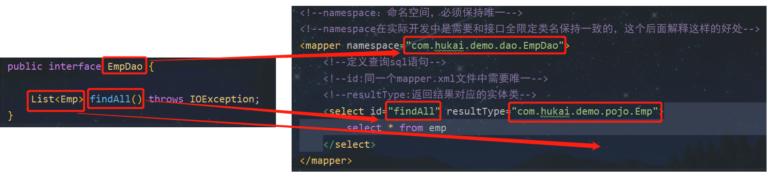 <select id="findAll" resultType="com.hukai.demo.pojo.Emp">