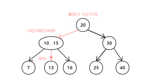 - 若它的值在节点中两个键之间,则进入中子节点继续查找;