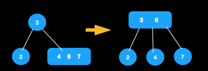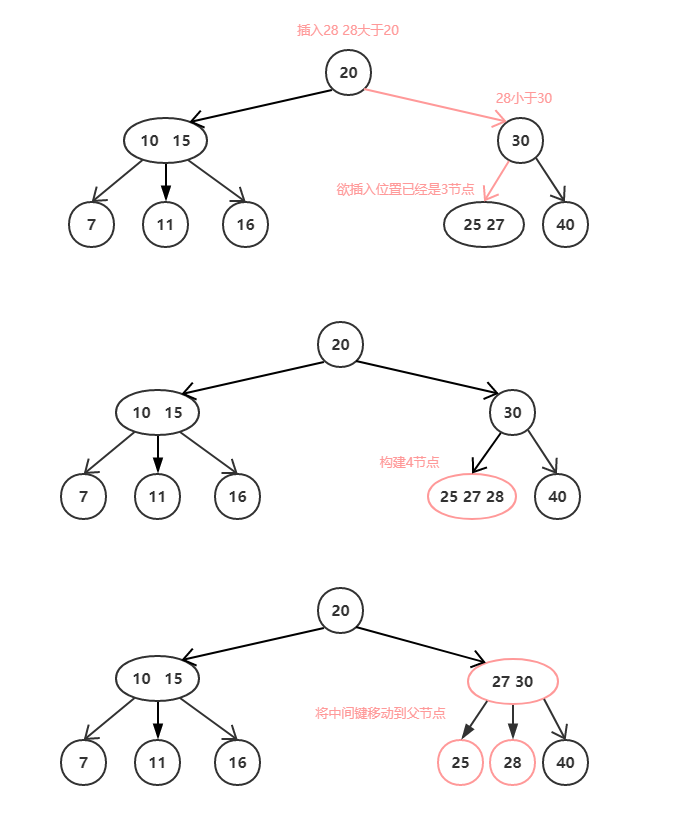 - 往父节点为2节点的3节点中插入一个新元素。在这种情况下进行插入操作时,会首先构造一个4节点。我们首先需要对这个4节点进行分裂,然后合并到父节点。若此时父节点这种种情况下树高依然不变。