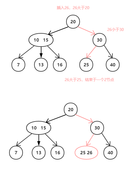 - 插入节点到一个2节点的叶子上。应该说,由于其本身就只有一个元素,所以只需要将其升级为3节点即可,该种情况下树的高度不变。