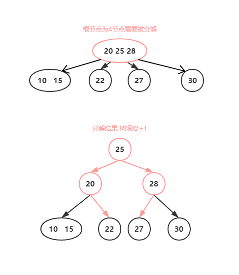 - 一个4节点包含小中大三个元素和四个孩子(或没有孩子),一个4节点要么没有孩子,要么具有4个孩子;