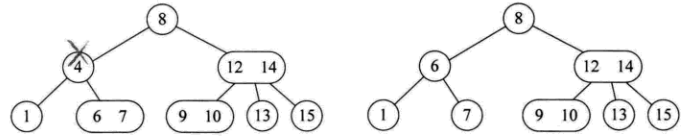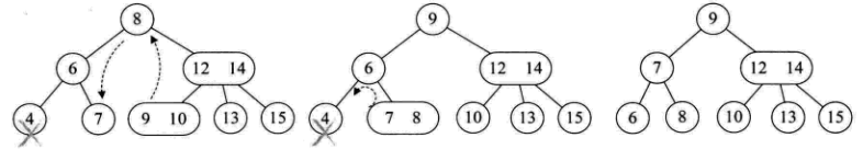 - 所删元素位于非叶子的分支节点。此时按树中序遍历得到此元素的前驱或后续元素,补位。分两种情况: