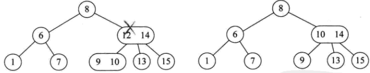 - 一个3节点包含一小一大两个元素和三个孩子(或没有孩子)。一个3节点要么没有孩子,要么具有3个孩子。如果某个3节点有孩子的话,左子树包含小于较小元素的元素,右子树包含大于较大元素的元素,中间子树包含介于两元素之间的元素;