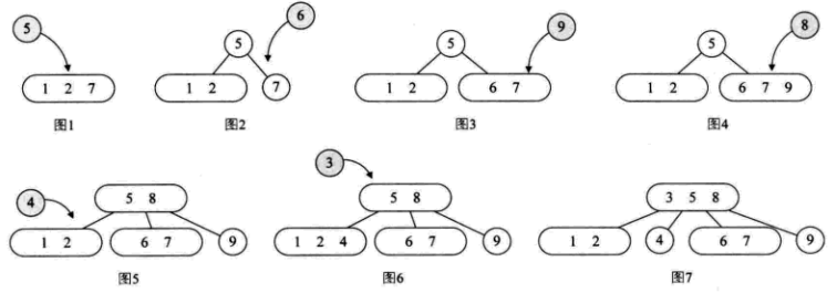 由于2-3-4树和2-3树是类似的,我们这里就简单介绍一下,如果我们构建一个数组为{7,1,2,5,6,9,8,4,3}的2-3-4过程: