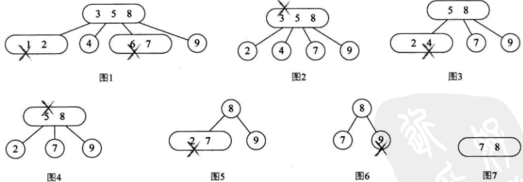下图是一个2-3-4树的删除节点演变过程,删除顺序是1、6、3、4、5、 2、9。