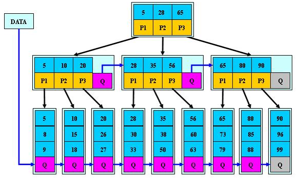 将B-Tree优化,由于B+Tree的非叶子节点只存储键值信息,假设每个磁盘块能存储4个键值及指针信息,则变成B+Tree后其结构如下图所示: