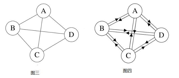 含有n个顶点的无向完全图有n*(n-1)/2条边。如图三就是无向完全图。