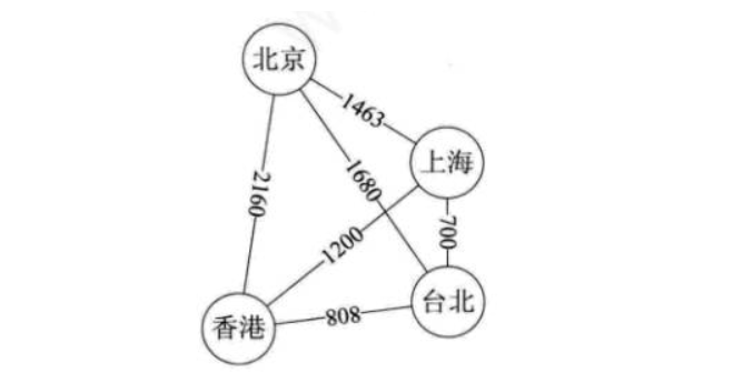 上图就是一张带权的图,即标识中国四大城市的直线距离的网,此图中的权就是两地的距离。