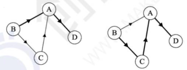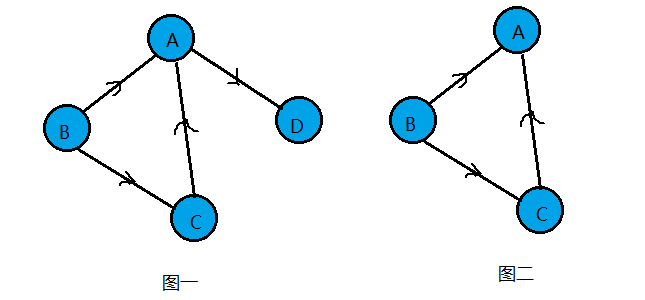 图二有向图中顶点A的入度为2(<B,A>,<C,A>),出度为1(<A,D>),多以顶点A的度为3。