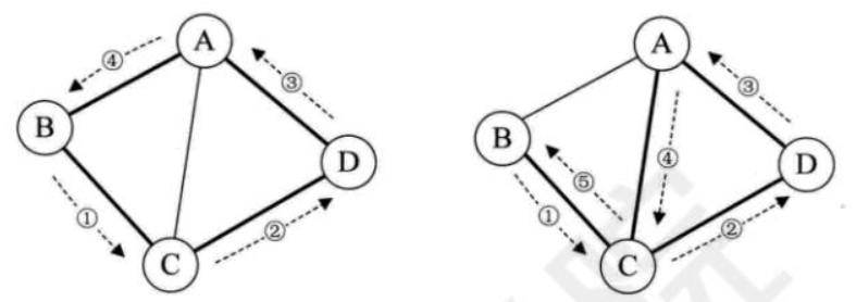 下图中两个图的粗线都构成环,左侧的环因第一个顶点和最后一个顶点都是B,且C、D、A没有重复出现,因此是一个简单环。而右侧的环,由于顶点C的重复,它就不是简单环了。