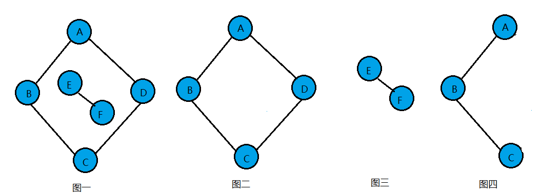 如下图:图一显然顶点A与顶点E或F就无路径,因此不能算是连通图,图二顶点A、B、C、D相互都是连通的,所以它本身是连通图。图一是一个无向非连通图。但是它有两个连通分量,即图二和图三。而图四,尽管是图一的子图,但是它却不满足连通子图的极大顶点数,因此它不是图一的无向图的连通分量。