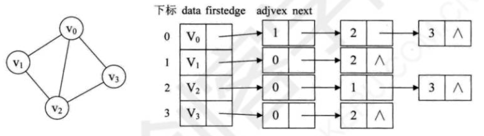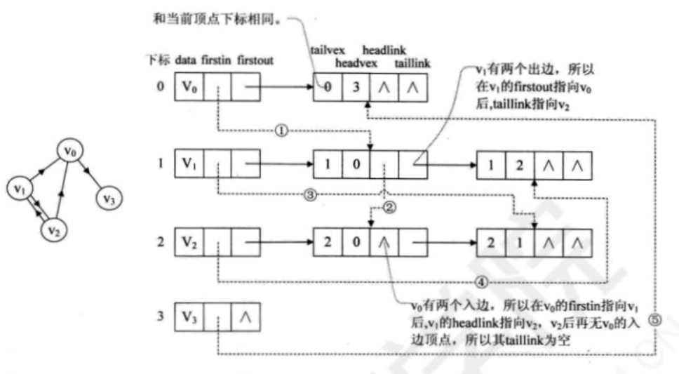 虚线箭头其实就是此图的逆邻接表表示。对于v0来说,它有两个顶点v1和v2的入边。因此v0的firstln指向顶点v1的边表结点中headvex为0的结点,接着由入边结点的headlink指向下个入边顶点v2。