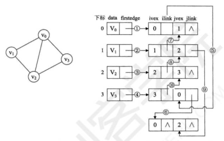 其中ivex和jvex是与某条边依附的两个顶点在顶点表中下标。ilink指向依附顶点ivex的下一条边,jlink指向依附顶点jvex的下一条边。这就是邻接多重表结构。