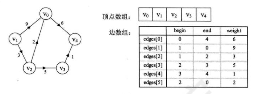 边集数组是由两个一维数组构成。一个是存储顶点的倌息;另一个是存储边的信息,这个边数组毎个数据元素由一条边的起点下标(begin)、终点下标(end)和权(weight)组成。